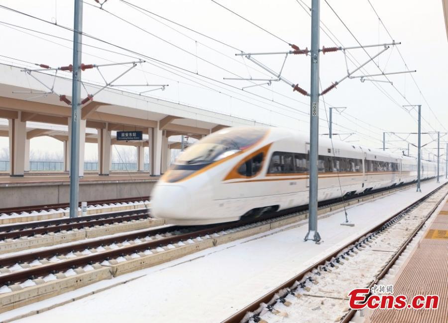 The G8841 high-speed bullet train bound for Tianjin arrives at Yongqing East railway station in north China's Hebei Province, Dec. 18, 2023. (Photo: China News Service/Jia Tianyong)