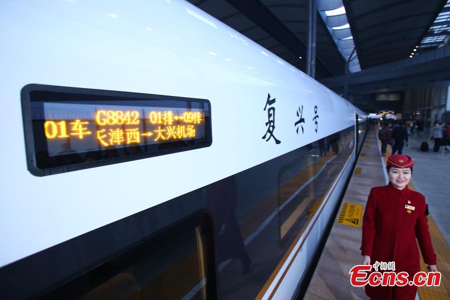 The G8841 high-speed bullet train bound for Beijing Daxing International Airport prepares to leave at the Tianjin West railway station in Tianjin, Dec. 18, 2023. (Photo: