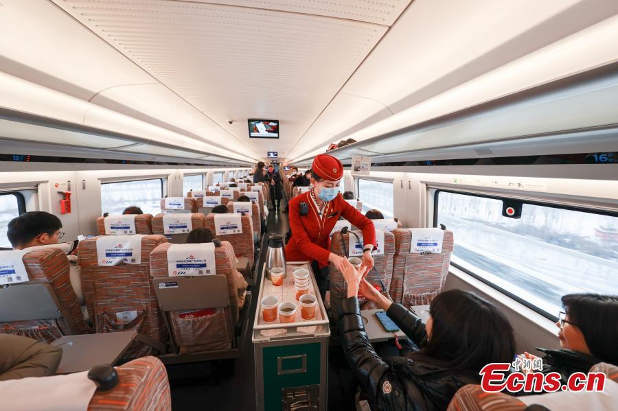 A train attendant offers tea to passengers aboard the G8841 high-speed bullet train bound for Beijing Daxing International Airport, Dec. 18, 2023. (Photo: China News Service/Jia Tianyong)