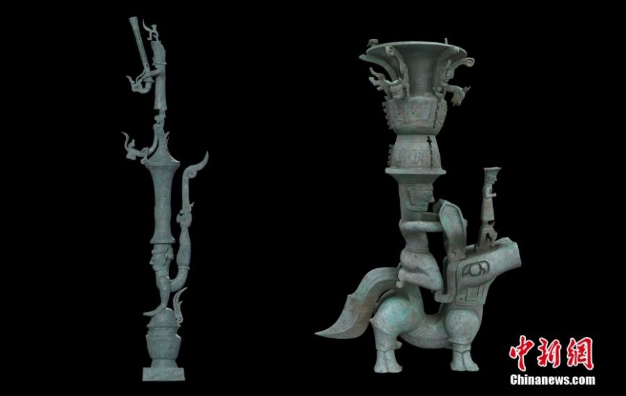 Two successfully matched bronze sculptures that depict a human kneeling on a beast and a bird-footed bronze sculpture unearthed from different pits of the famed Sanxingdui Ruins site are displayed in southwest China's Sichuan Province. (Photo provided to China News Service)