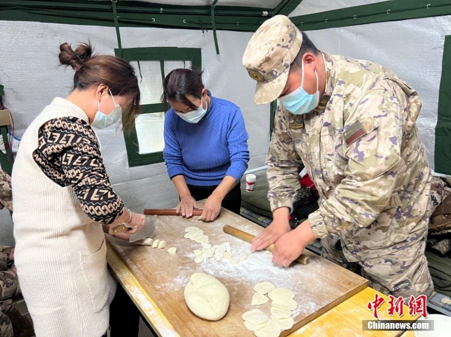 Officers make dumplings together at a resettlement center in Minhe County, Qinghai Province, Dec. 22, 2023.(Photo/China News Service)