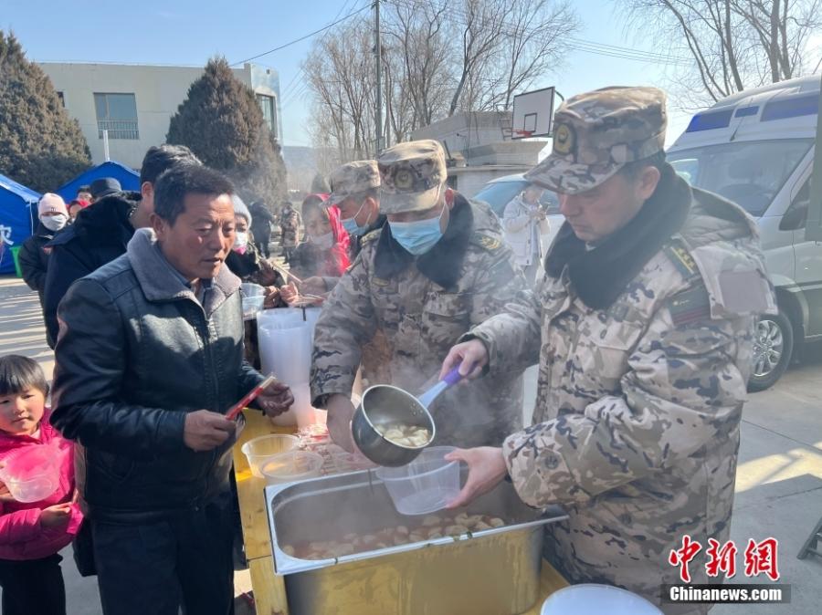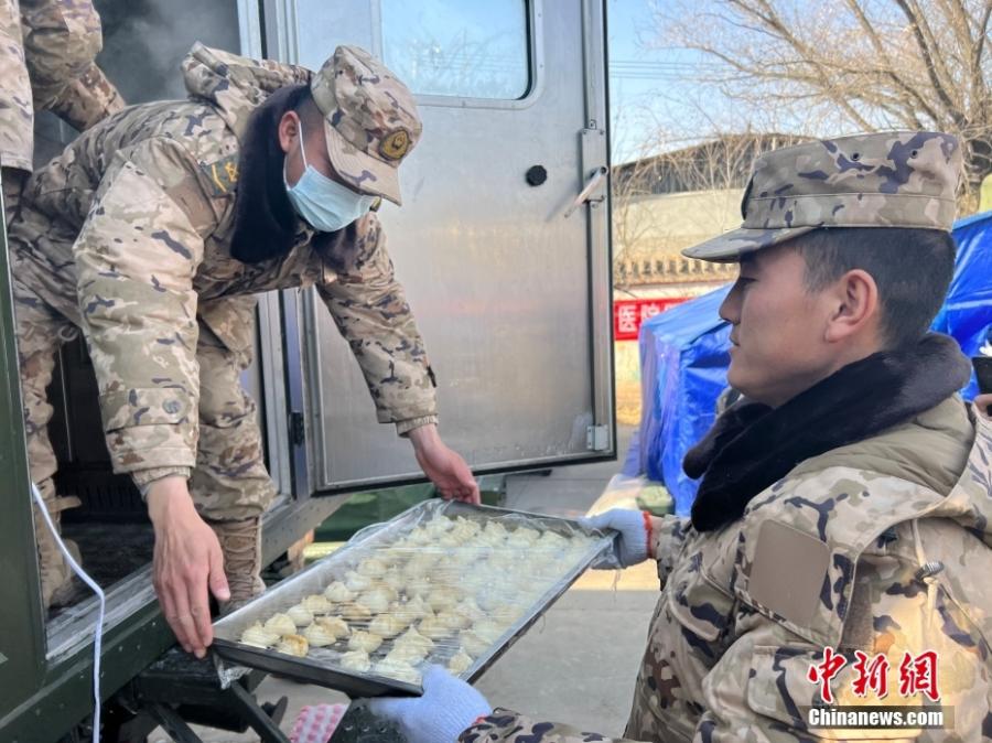 Officers distribute dumplings for people in Minhe County, Qinghai Province, Dec. 22, 2023. (Photo/China News Service)