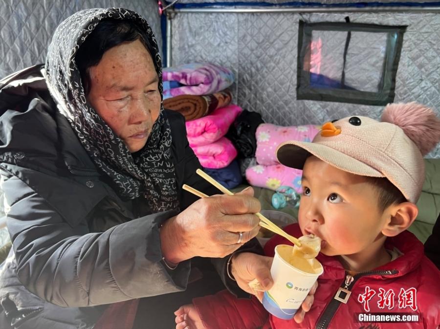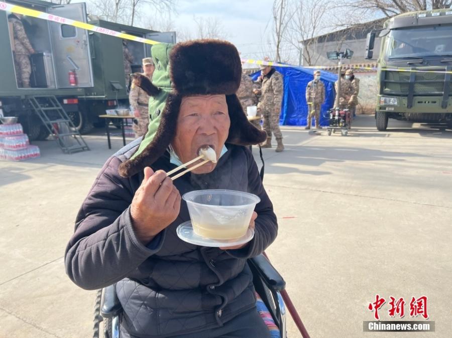 An elderly eats dumplings at a resettlement center in Minhe County, Qinghai Province, Dec. 22, 2023. (Photo/China News Service)