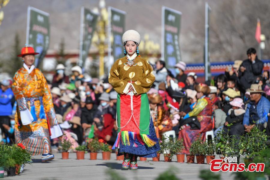 Models present traditional Tibetan costumes during the first Lhasa Fashion Week held at the Potala Palace square in Lhasa, southwest China's Xizang Autonomous Region, Dec. 24, 2023. Models presented 60 traditional Tibetan costumes in the fashion show. (Photo/China News Service)