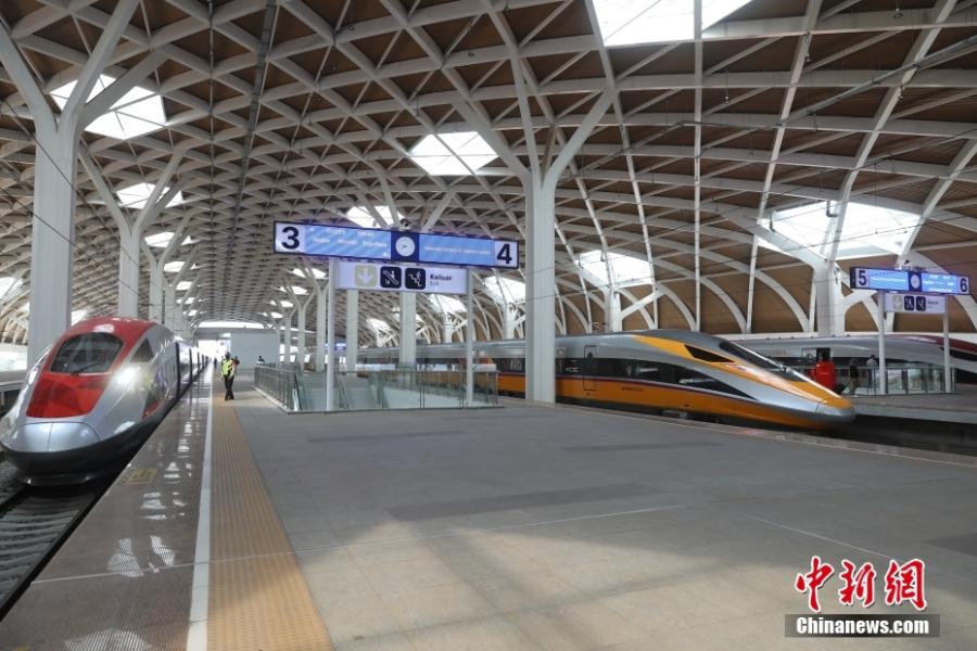 High-speed electrical multiple unit (EMU) trains stop at Halim Station in Jakarta, Indonesia, Dec. 25, 2023. (Photo: China News Service/Li Zhiquan)