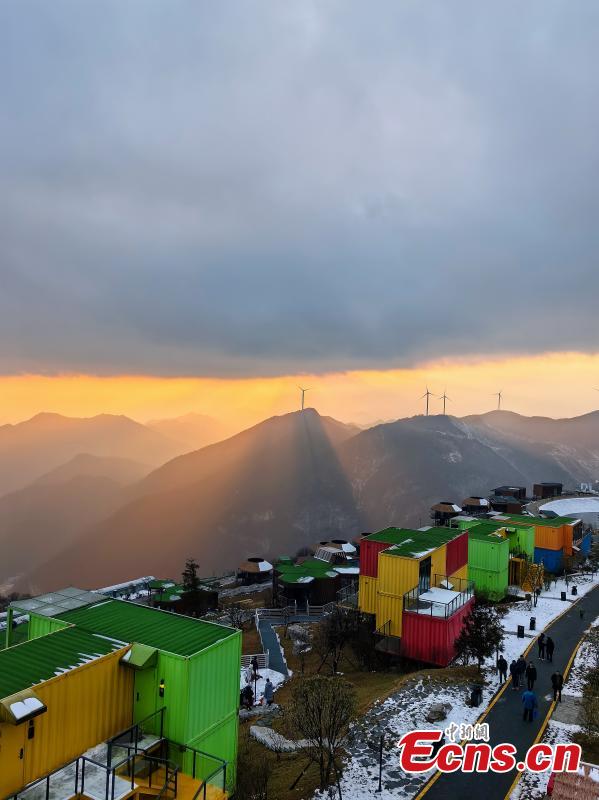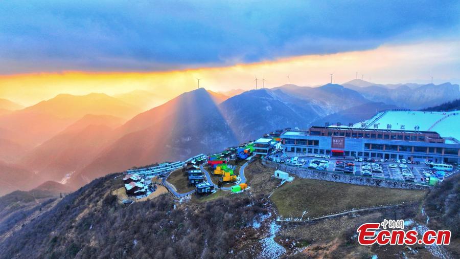 Golden light breaks through clouds at sunset, forming the Tyndall effect over a mountain in Wufeng Tujia Autonomous County, central China's Hubei Province, Dec. 23, 2023. (Photo: China News Service/Zhou Xingliang)