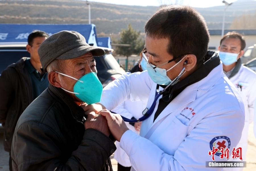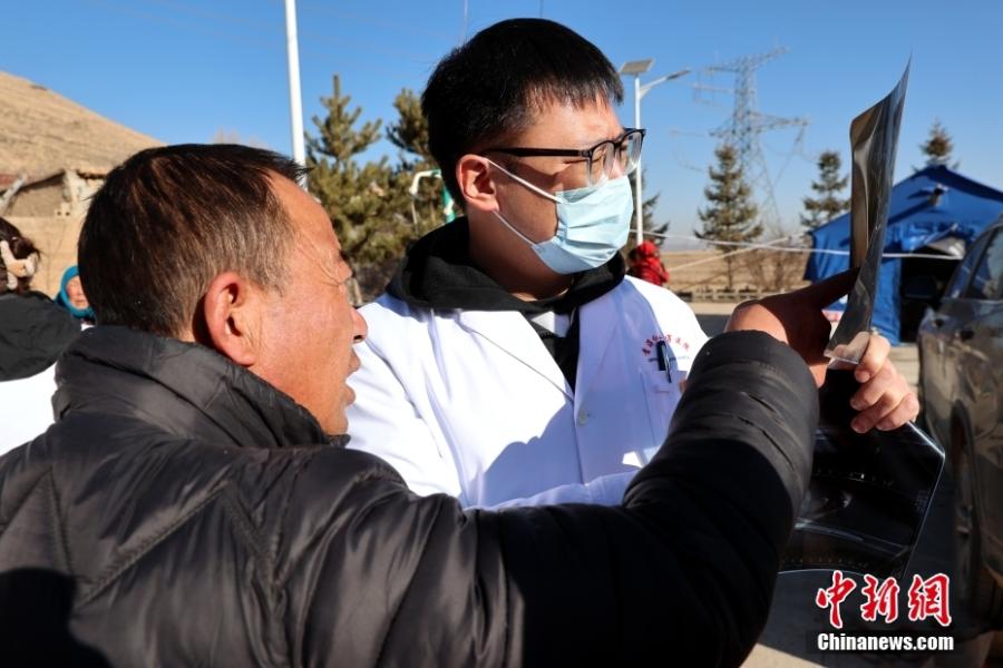 A doctor conducts check-up for a local resident in quake-hit Haidong City, northwest China's Qinghai Province, Dec. 27, 2023. (Photo: China News Service/Xue Di)