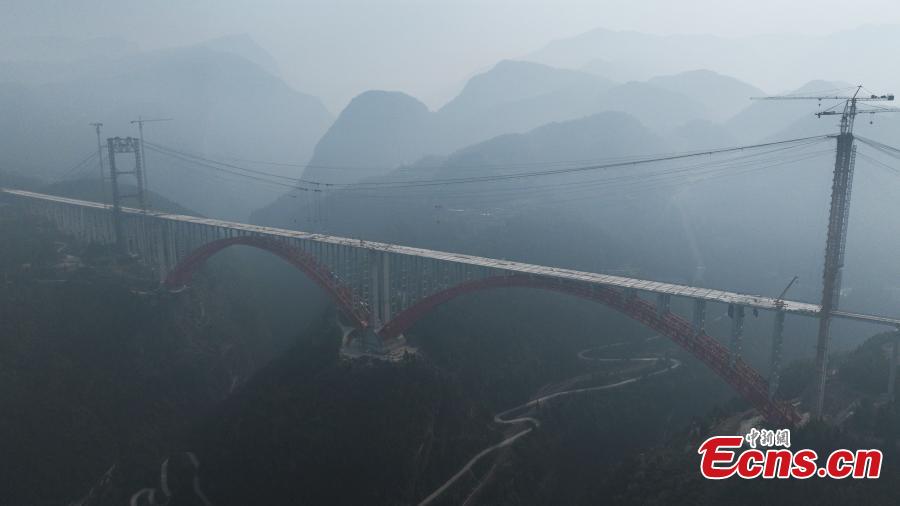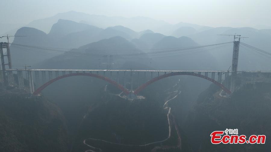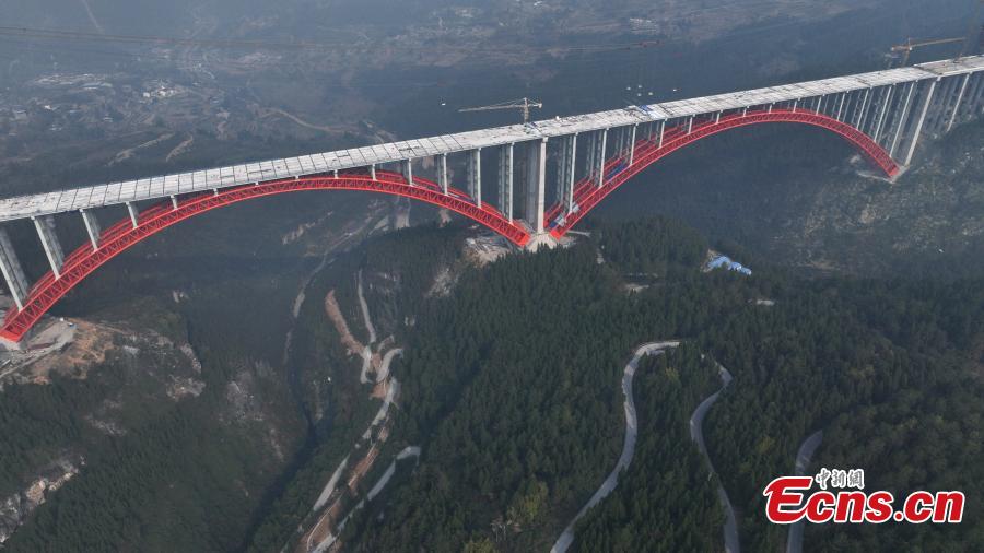 Aerial view of the construction site of the Shuangbao Grand Bridge, the world's largest double arch bridge, in Chongqing, Dec. 27, 2023. (Photo: China News Network/Chen Chao)