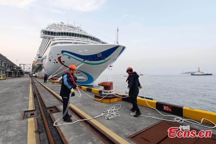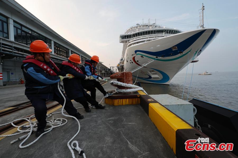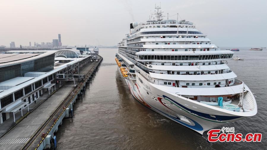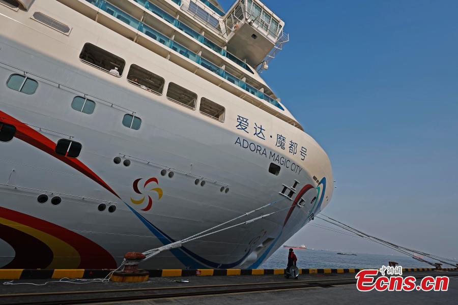 China's first domestically built large cruise ship, the Adora Magic City, docks at the Shanghai Wusongkou International Cruise Port on Jan. 1, 2024. (Photo/China News Service)