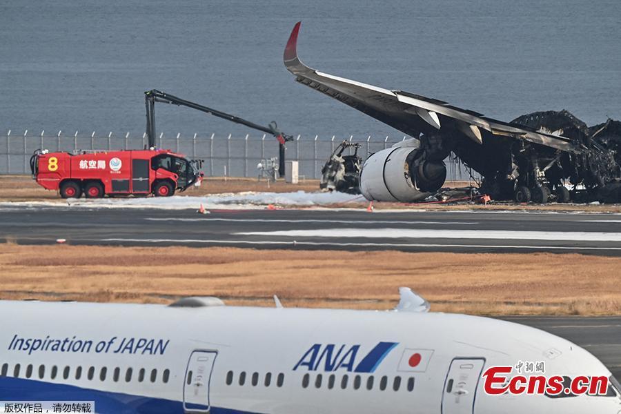 An All Nippon Airlines (ANA) plane taxis past the burnt wreckage of a Japan Airlines (JAL) passenger plane on the tarmac at Tokyo International Airport at Haneda in Tokyo on January 3, 2024, the morning after the JAL airliner hit a smaller coast guard plane on the ground.(Photo/Agencies)