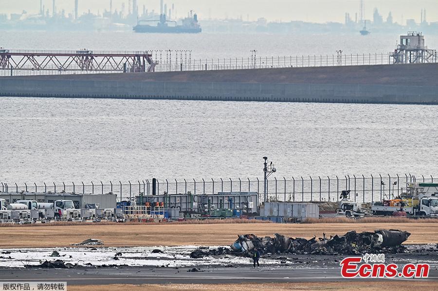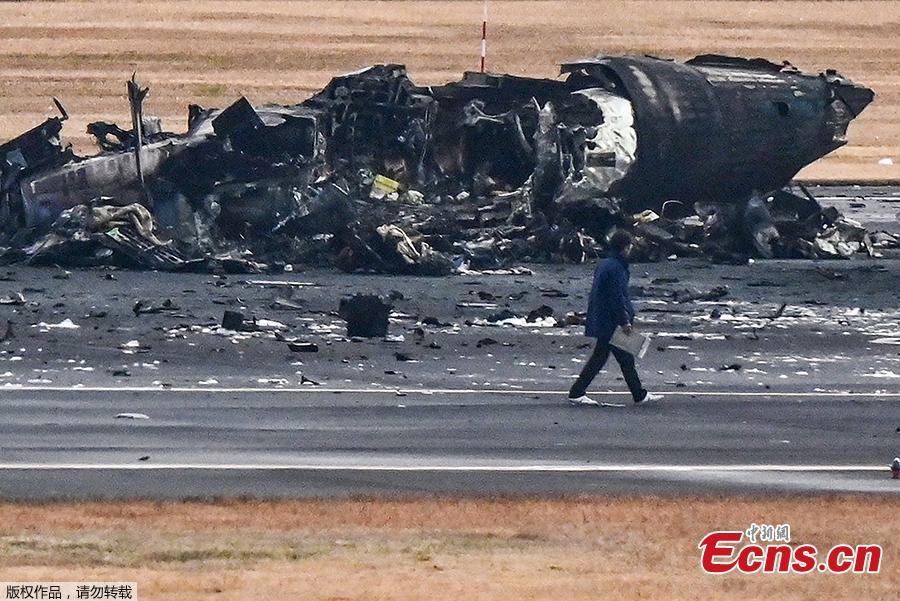 An official looks at the wreckage of a Japan coast guard plane on the tarmac at Tokyo International Airport at Haneda in Tokyo on January 3, 2024, the morning after a Japan Airlines airliner hit the smaller coast guard plane on the ground. (Photo/Agencies)