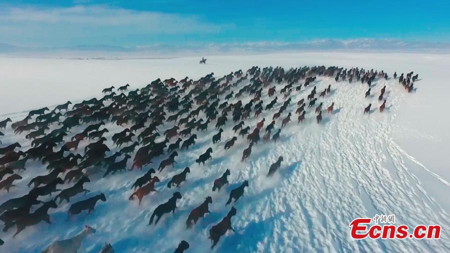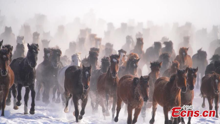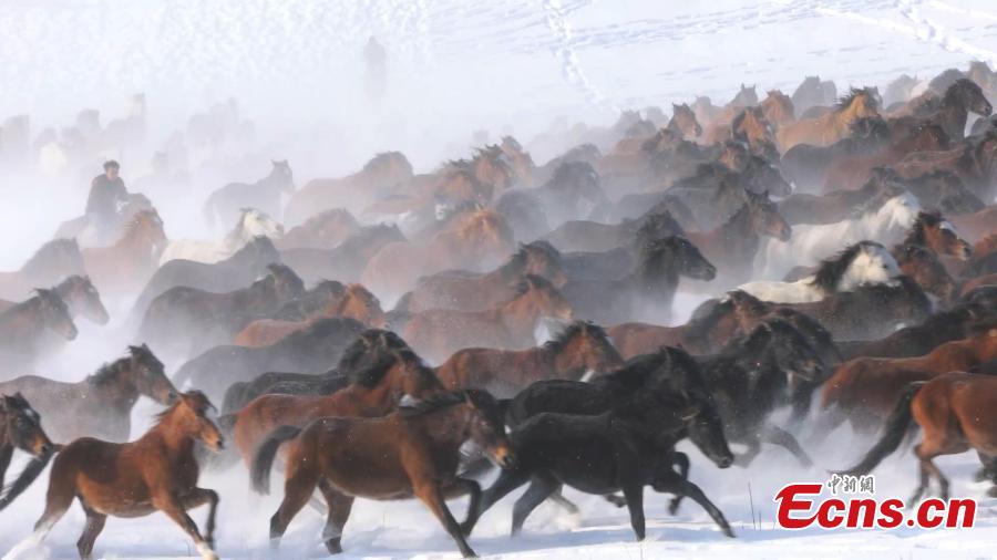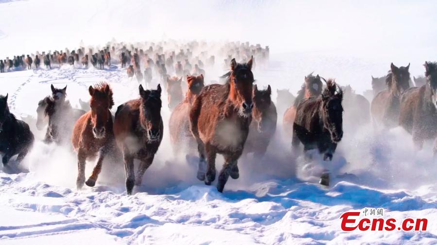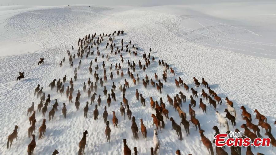 Horses gallop on a snow-covered grassland in Zhaosu County, Kazak Autonomous Prefecture of Ili, northwest China's Xinjiang Uyghur Autonomous Region, Jan. 3, 2024. The performance produces fascinating attraction in Xinjiang. (Photo/China News Service)
