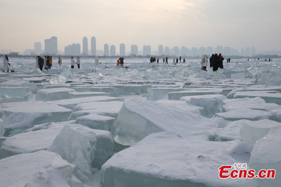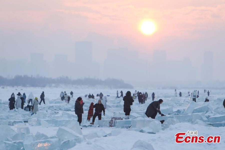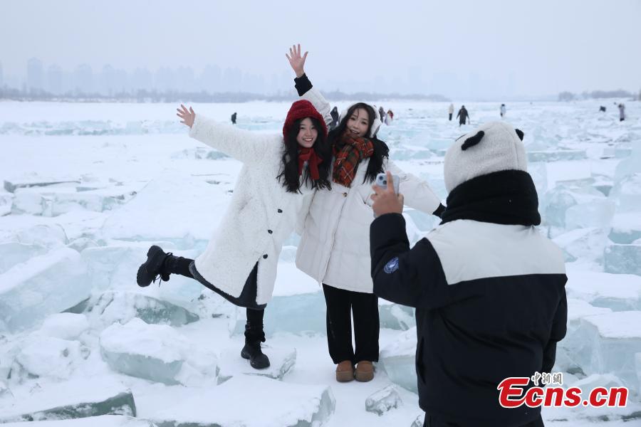 Tourists pose for photos on the frozen Songhuajiang River in Harbin, northeast China's Heilongjiang Province, Jan. 6, 2024. (Photo: China News Service/Yu Kun)