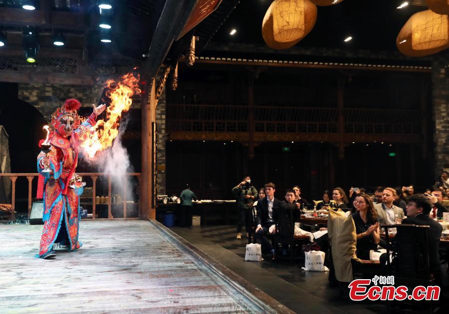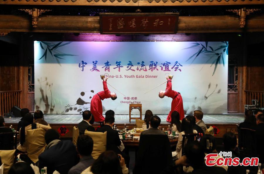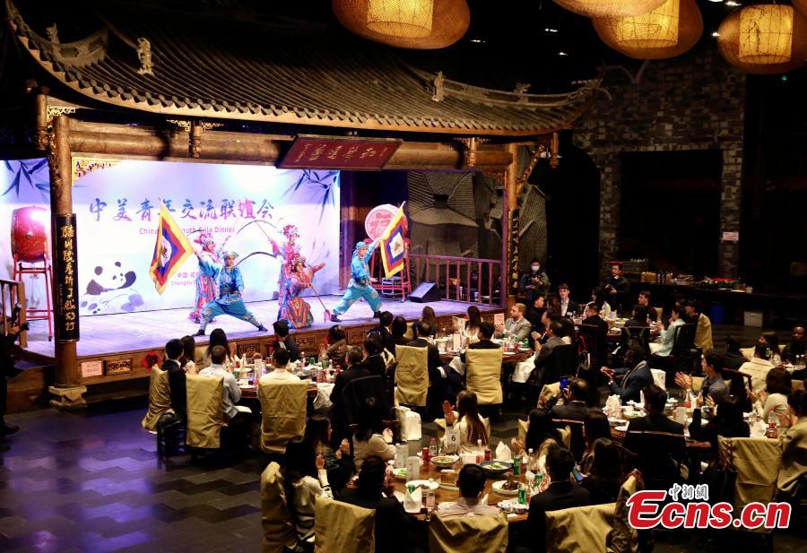 U.S. students watch tea pouring performance during a gala dinner in Chengdu, southwest China's Sichuan Province, Jan. 7, 2024. (Photo: China News Service/Wang Lei)