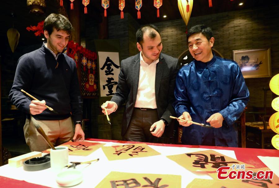 U.S. students learn to write Chinese character of "Loong" during a China-U.S. youth exchange program in Chengdu, southwest China's Sichuan Province, Jan. 7, 2024. (Photo: China News Service/Wang Lei)