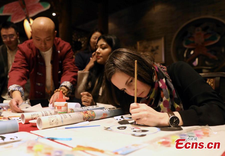 A U.S. student draws a kite during a China-U.S. youth exchange program in Chengdu, southwest China's Sichuan Province, Jan. 7, 2024. (Photo: China News Service/Wang Lei)