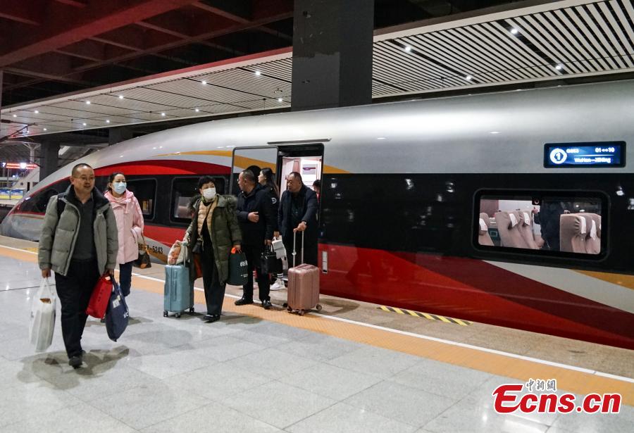 Passengers get off the Fuxing Intelligent EMU train G853 at Xining railway station, northwest China's Qinghai Province, Jan. 10, 2024. (Photo: China News Service/Ma Mingyan)