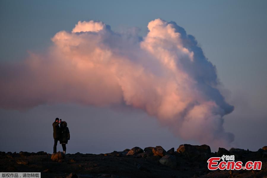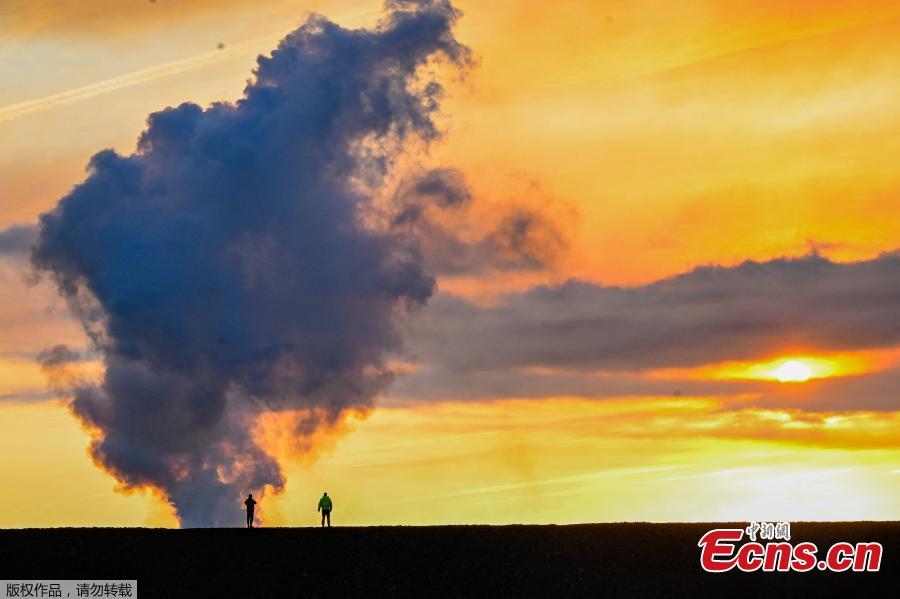 Billowing smoke is seen on the outskirts of the southwestern Icelandic town of Grindavik after a volcano erupts, Iceland, Jan. 14, 2024. (Photo/Agencies)