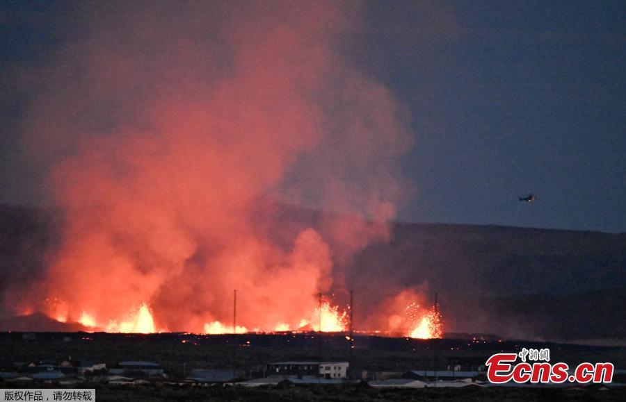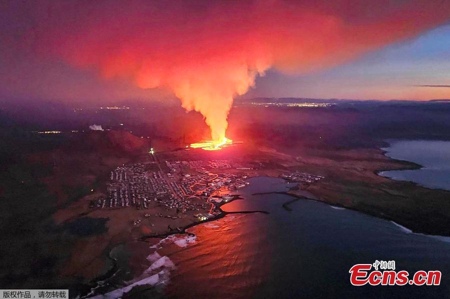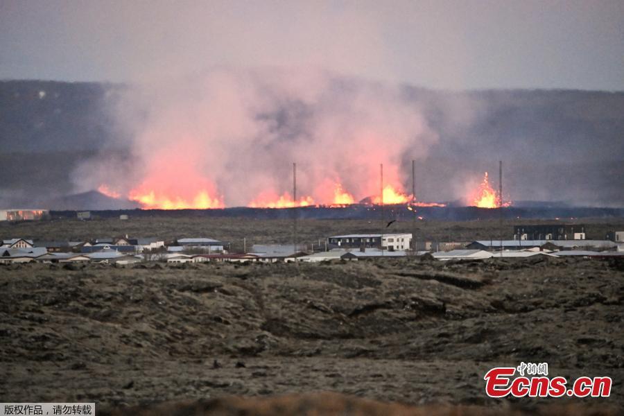Lava explosions and billowing smoke are seen near residential buildings in the southwestern Icelandic town of Grindavik after a volcano erupts, Iceland, Jan. 14, 2024. (Photo/Agencies)