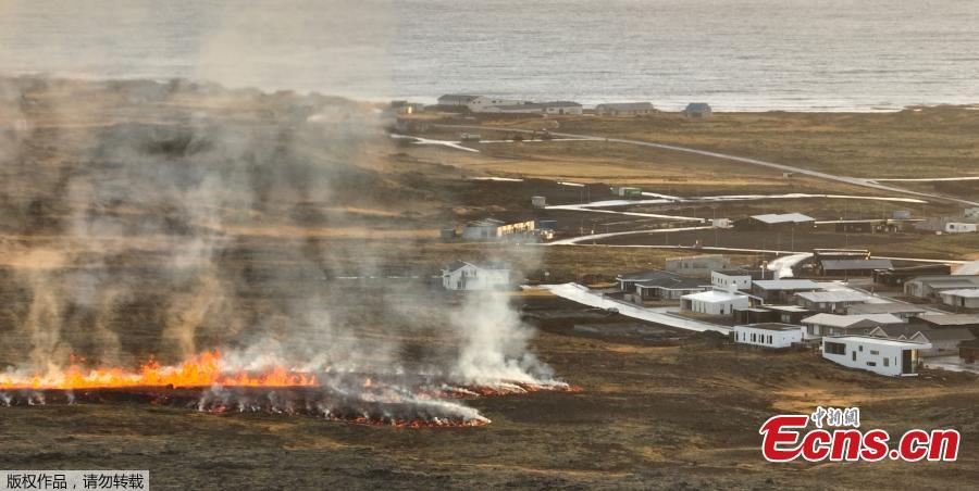 Aerial view shows flowing lava close to houses of the southwestern Icelandic town of Grindavik after a volcano erupts, Iceland, Jan. 14, 2024. (Photo/Agencies)