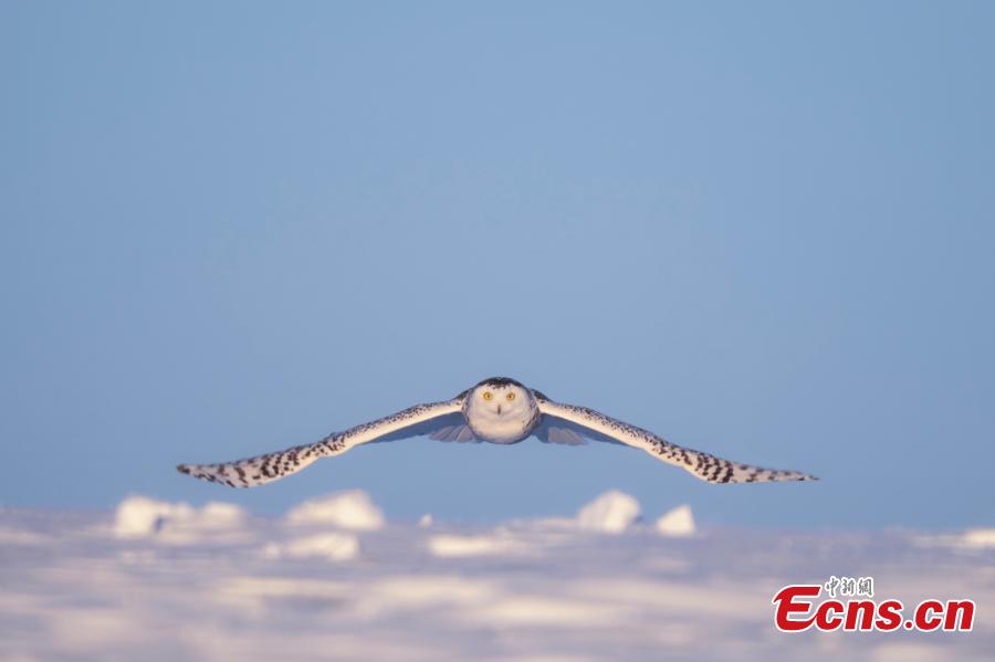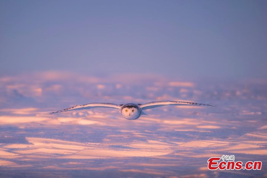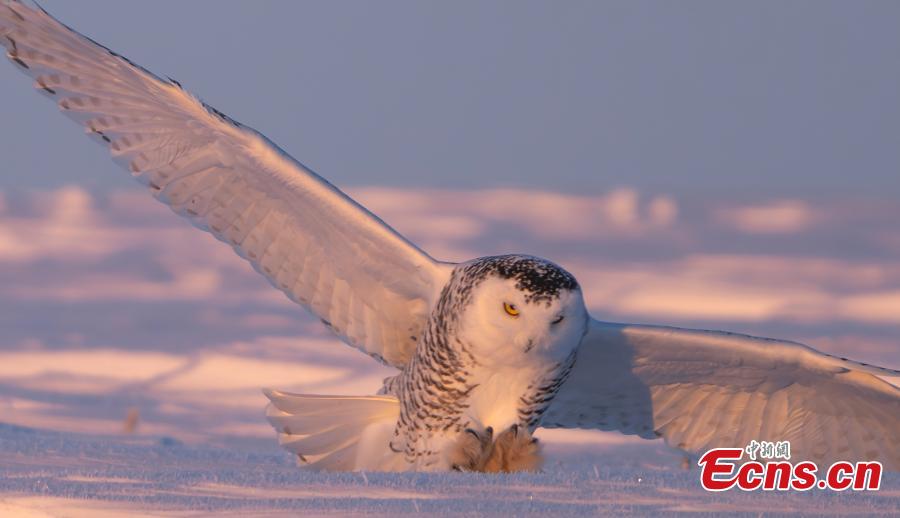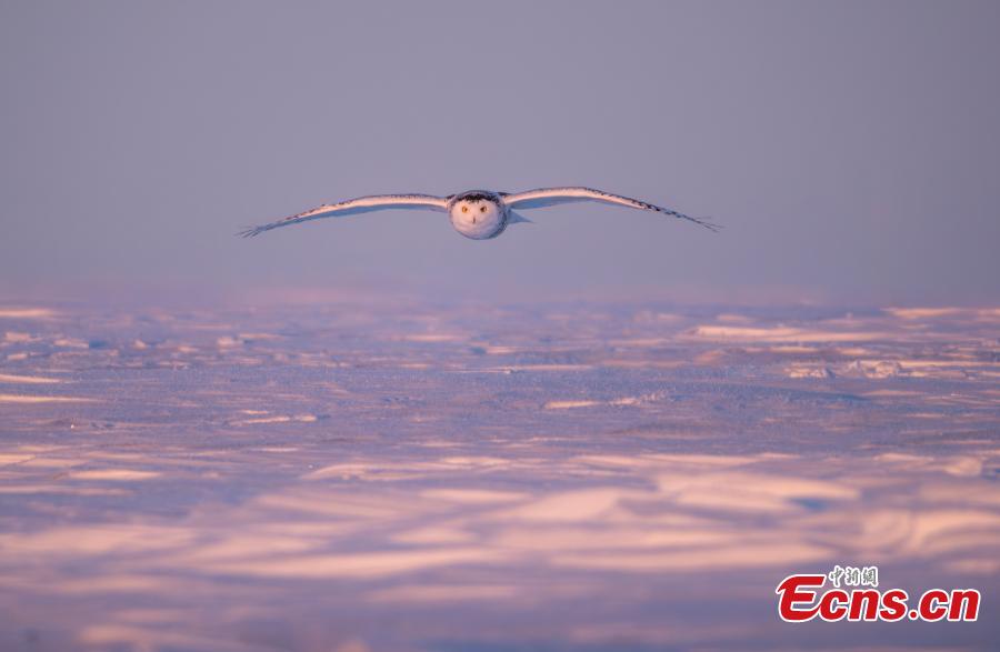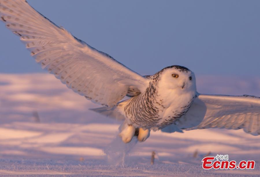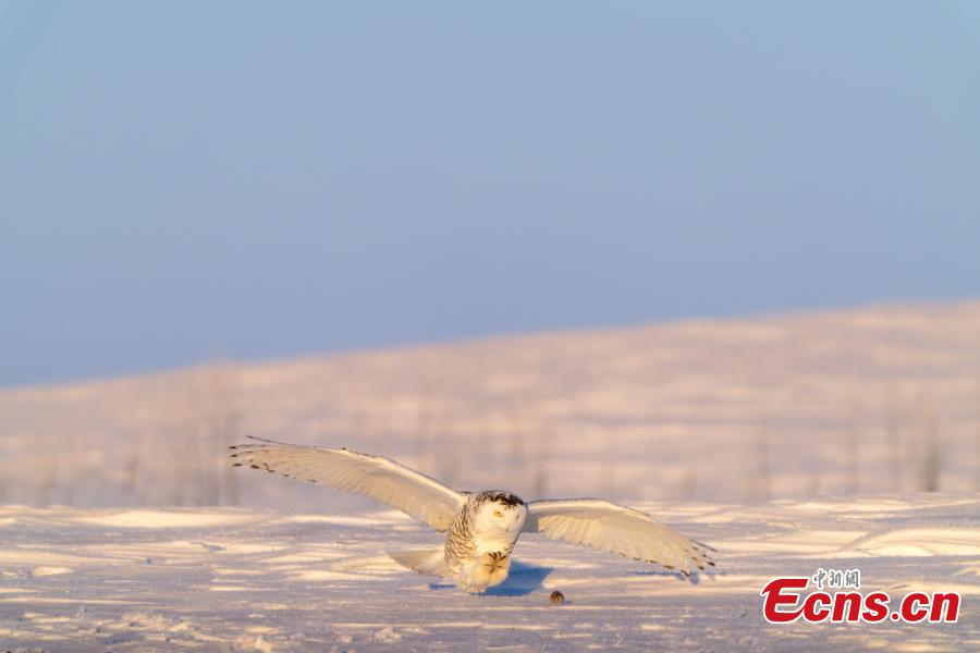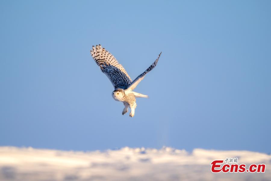 A rare snowy owl is captured flying over the Hulun Buir grassland in Hulun Buir, north China's Inner Mongolia Autonomous Region, looking like Harry Potter's owl Hedwig in the movie. (Photo: China News Service/Tian Hoalin)