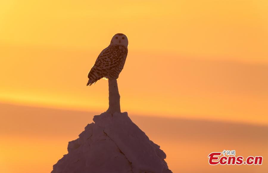 A rare snowy owl rests on a pile of snow at the Hulun Buir grassland in Hulun Buir, north China's Inner Mongolia Autonomous Region, looking like Harry Potter's owl Hedwig in the movie. (Photo: China News Service/Tian Hoalin)