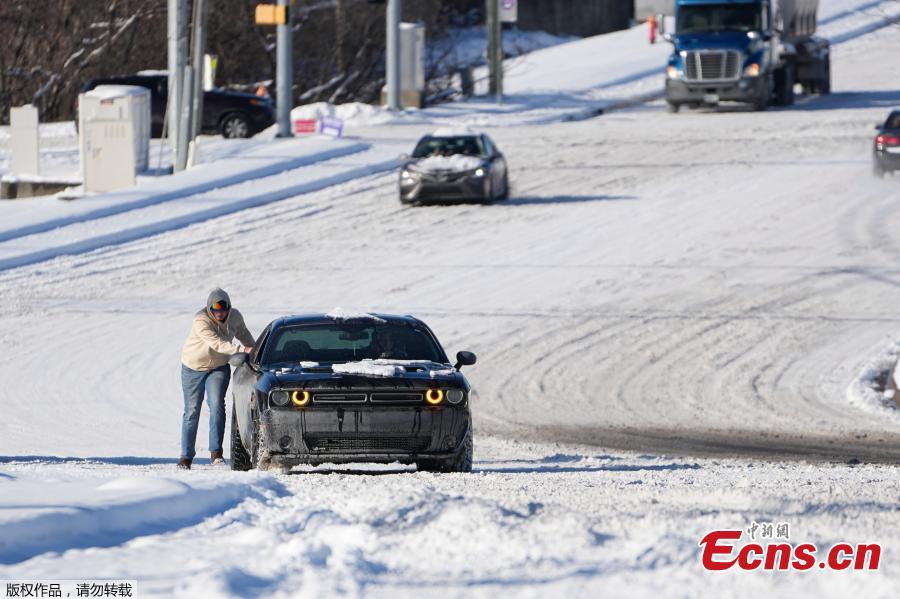 A motorist is pushed through the snow in Nashville, Tennessee, the United States, Jan. 16, 2024. (Photo/Agencies)