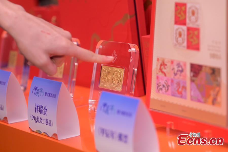 The special stamps and gold bars marking the Chinese zodiac Year of the Dragon are displayed during a launching ceremony of China Post’s first-ever digital collection of special stamps at Hong Kong Cyberport, on Jan 18, 2024. (Photo: China News Service/Chen Yongnuo)