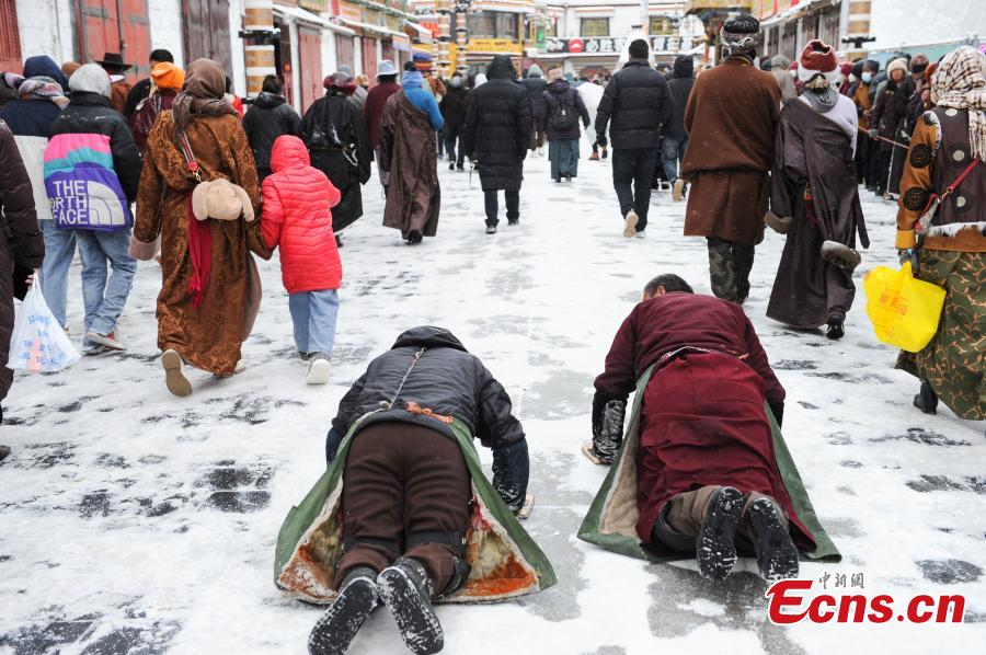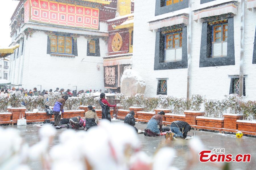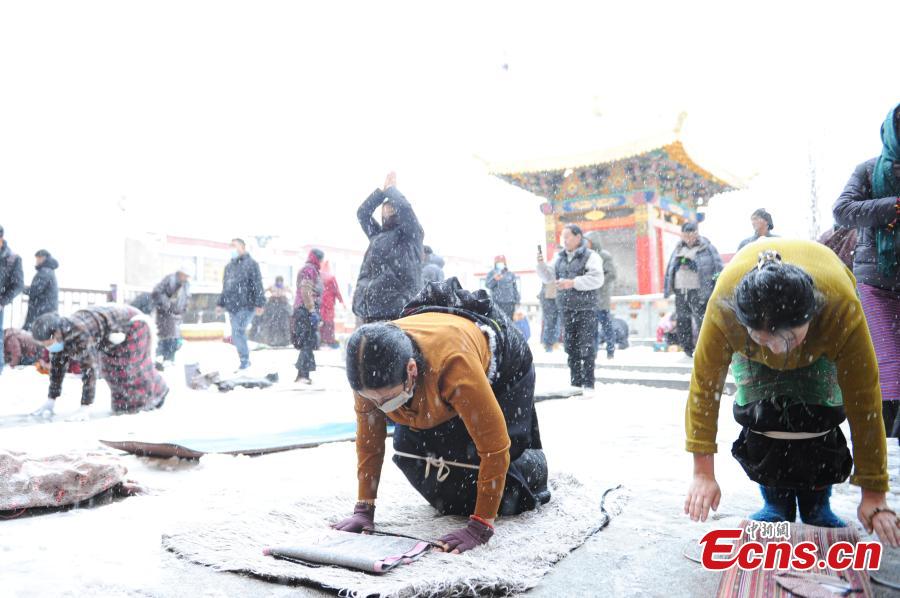 Tibetan pilgrims pray in front of the Jokhang Temple after snow in Lhasa, southwest China's Xizang Autonomous Region, Jan. 18, 2024. (Photo/China News Service)