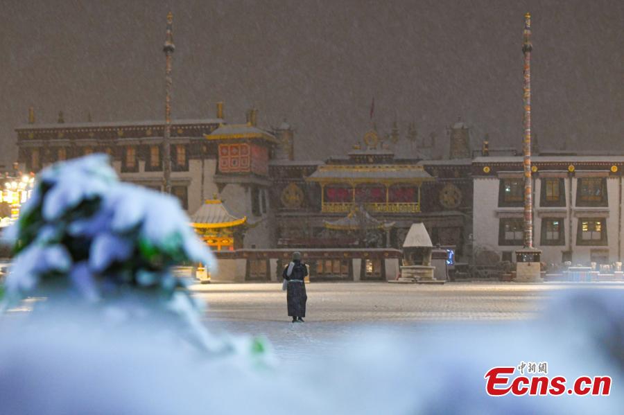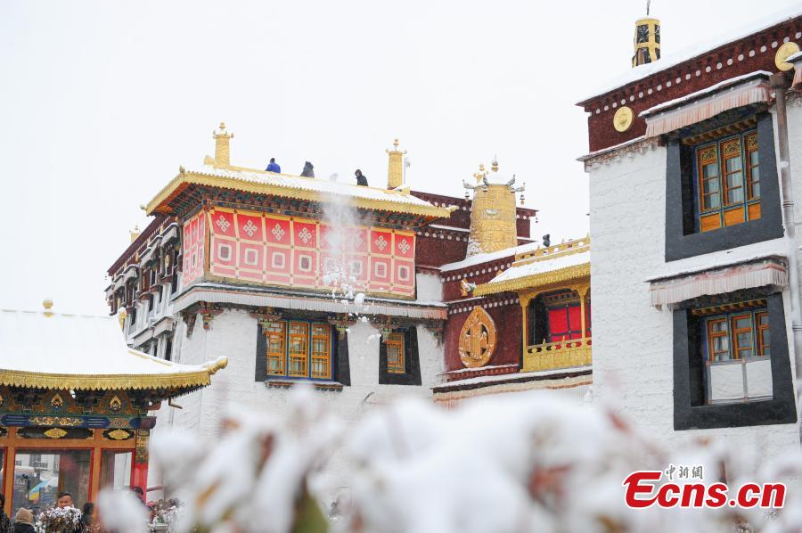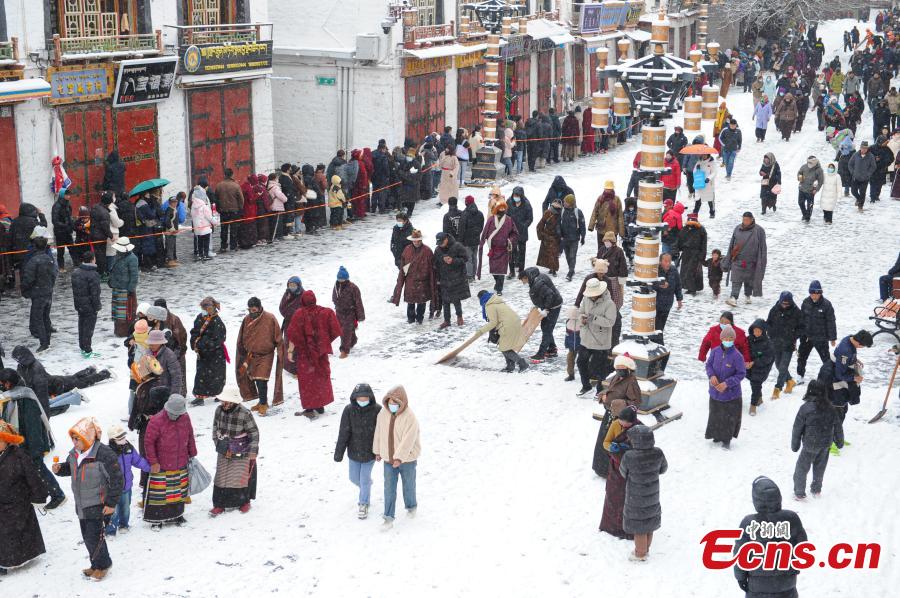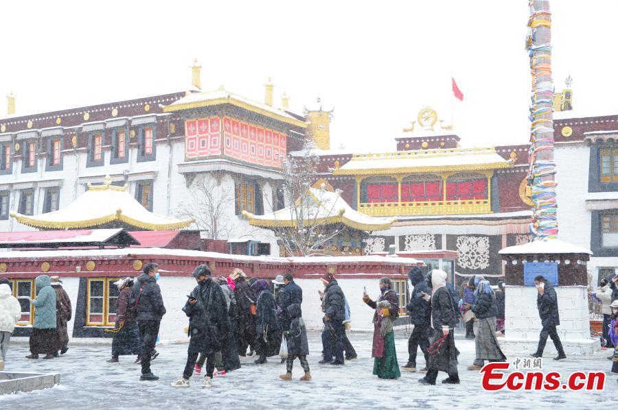 People walk in the snow on Barkhor Street in Lhasa, southwest China's Xizang Autonomous Region, Jan. 18, 2024. (Photo/China News Service)
