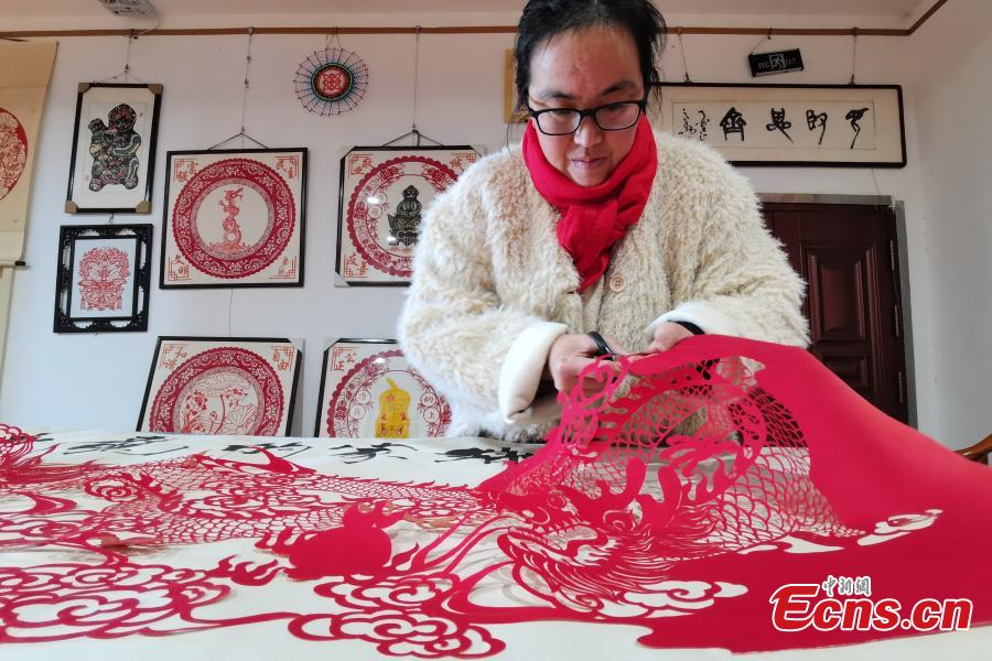 A folk artist makes dragon-themed paper cutting in Huaiyang, central China's Henan Province, Jan. 21, 2024. (Photo: China News Service/Yang Zhenghua)
