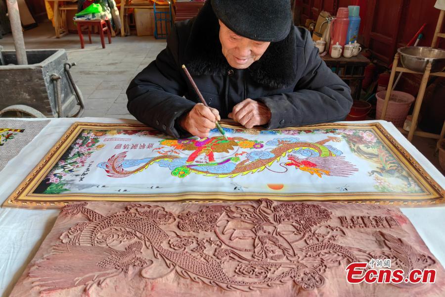 A folk artist carves a dragon-themed woodblock New Year painting plate in Zhoukou, central China's Henan Province, Jan. 21, 2024. (Photo: China News Service/Yang Zhenghua)