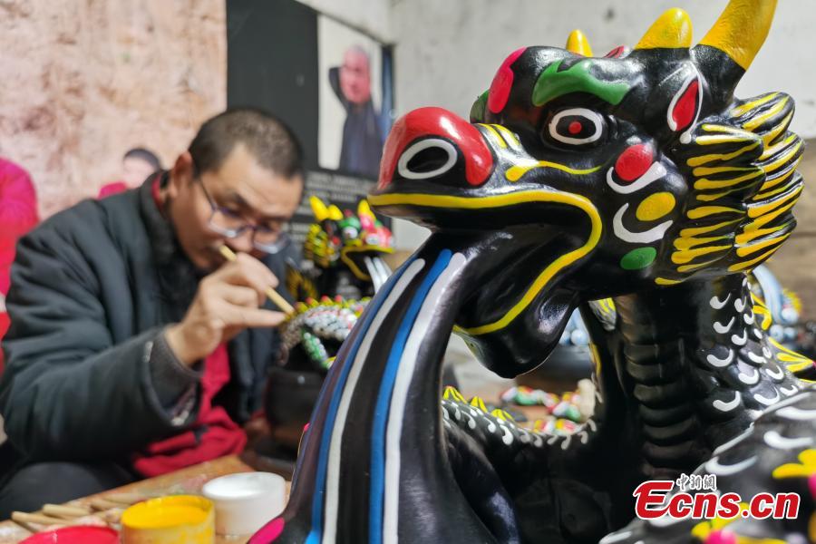 A folk artist colors a dragon-themed "muddy dog," or ninigou, in Huaiyang, central China's Henan Province, Jan. 21, 2024. (Photo: China News Service/Yang Zhenghua)