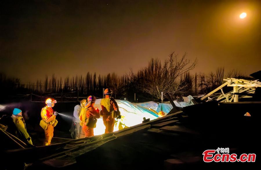 Rescuers clear debris from a damaged house in Wushi County of Aksu Prefecture, northwest China's Xinjiang Uyghur Autonomous Region, Jan. 23, 2024. (Photo: China News Service/Wang Xudong)
