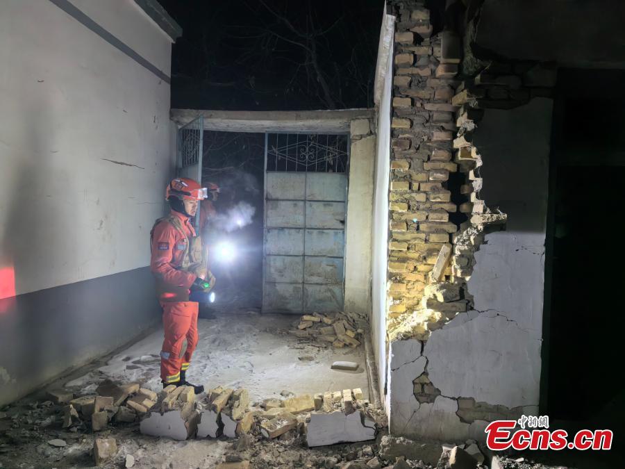 A rescuer checks the damage of a house after a 7.1-magnitude quake hit Wushi County of Aksu Prefecture in northwest China's Xinjiang Uyghur Autonomous Region, Jan. 23, 2024. (Photo: China News Service/Wang Xudong)
