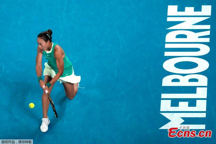 Zheng Qinwen of China plays a forehand return to Dayana Yastremska of Ukraine during their semifinal match at the Australian Open tennis championships at Melbourne Park, Australia, Jan. 25, 2024. (Photo/Agencies)