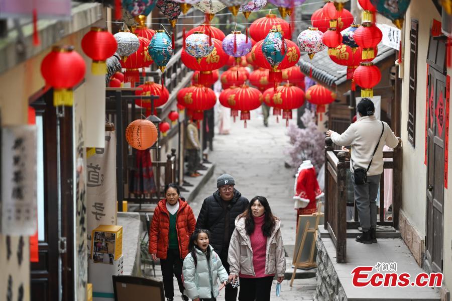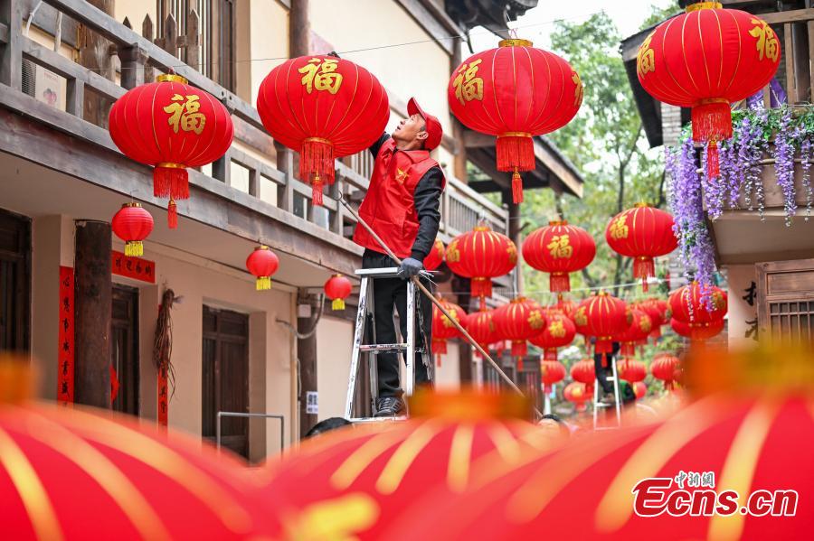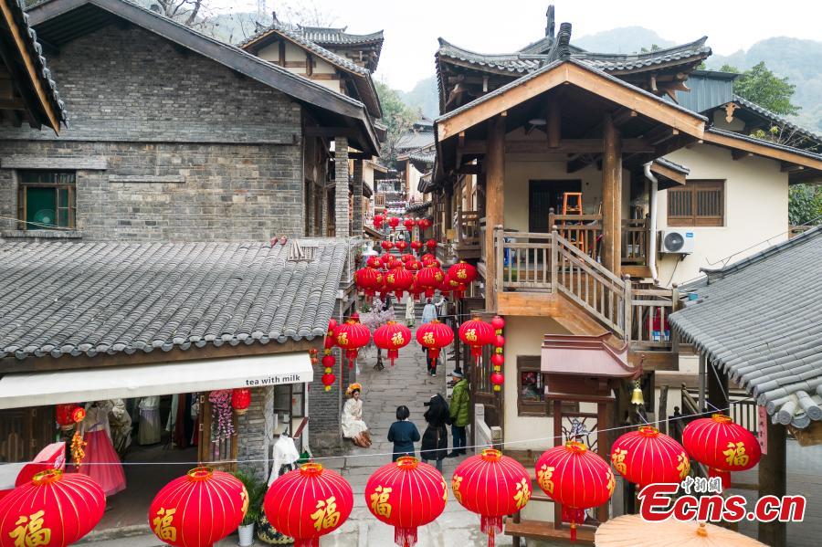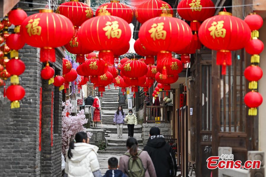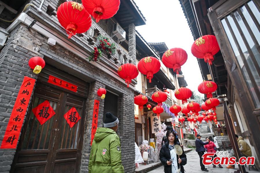 Red lanterns are hung along the Huangge ancient road to celebrate the Chinese New Year in Chongqing, Jan. 25, 2024. (Photo: China news Service/He Penglei)