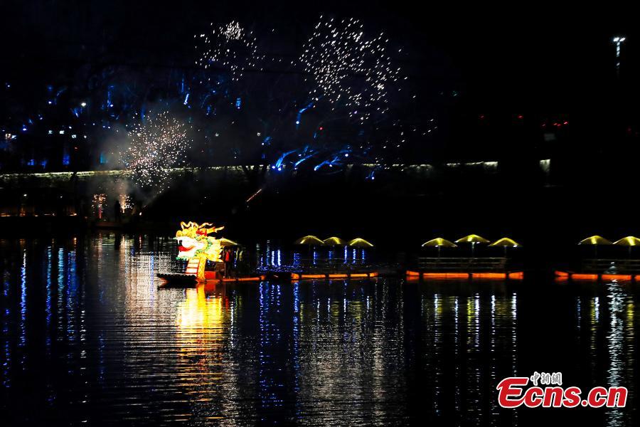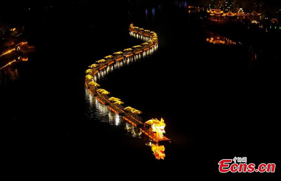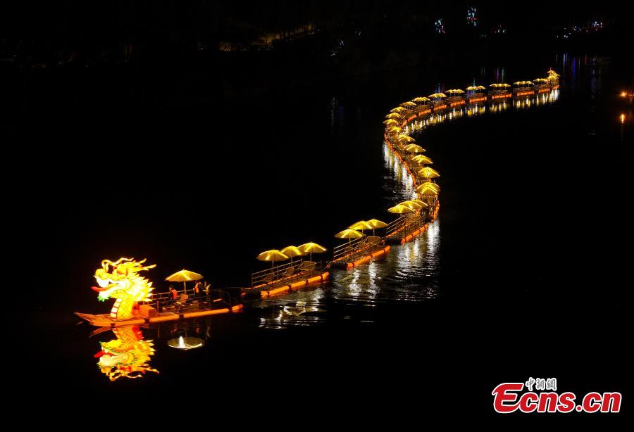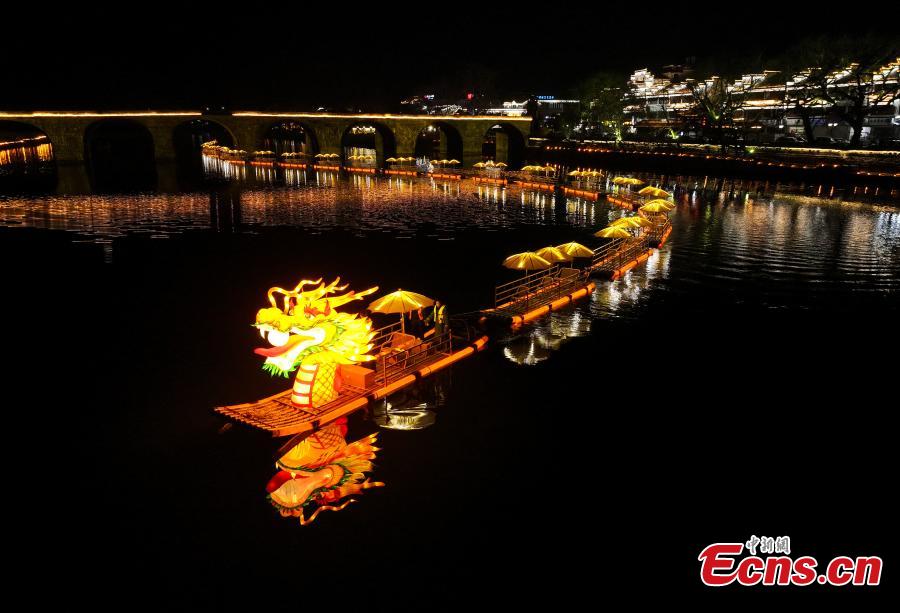 A 200-meter-long fleet of lit-up boats with a dragon head rafting along Hengjiang River at night adds afestive atmosphere in Huangshan, east China's Anhui Province, Jan. 27, 2024. (Photo: China News Service/Shi Yalei)