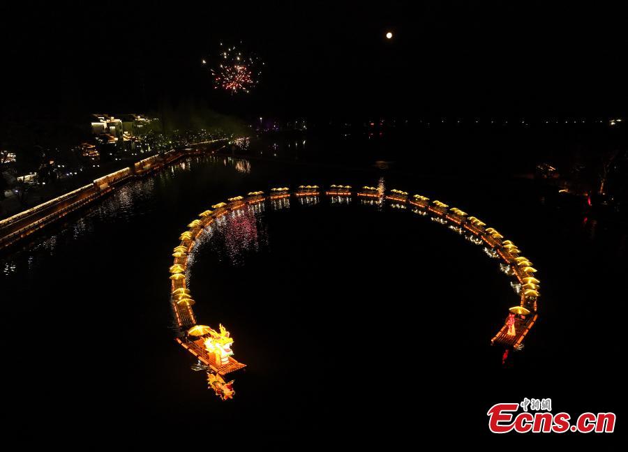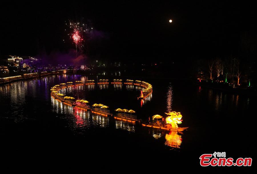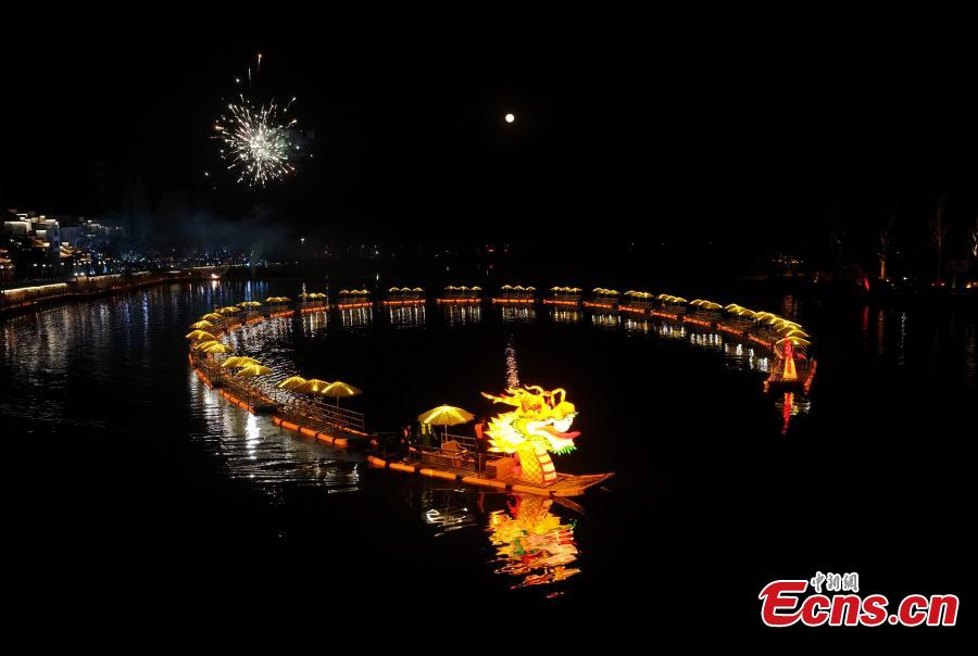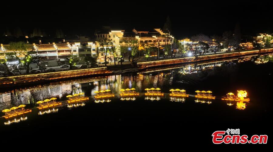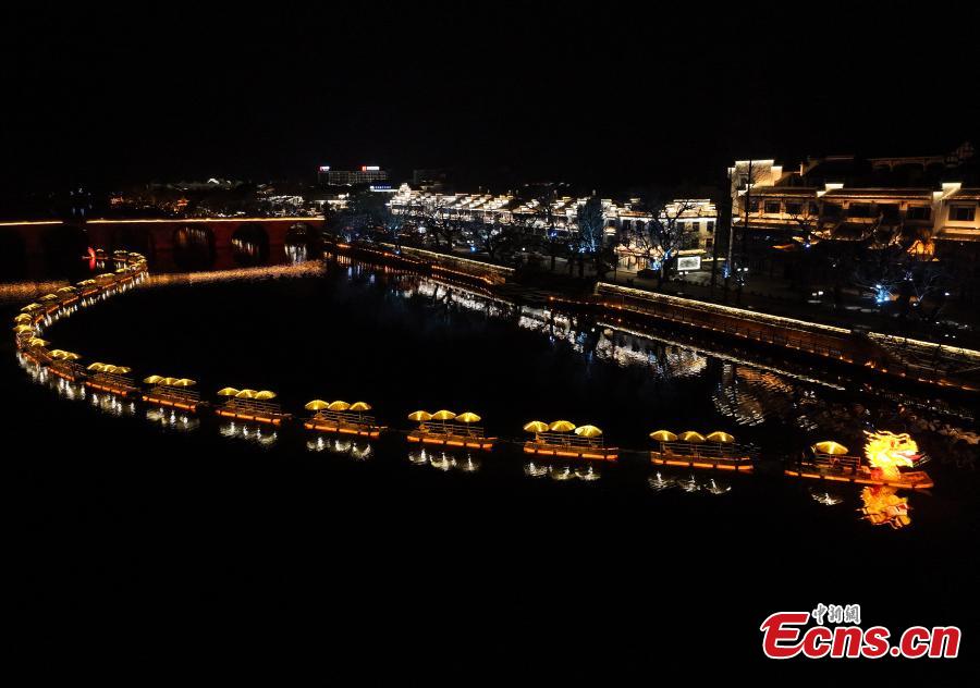 A 200-meter-long fleet of lit-up boats with a dragon head rafting along Hengjiang River at night adds afestive a tmosphere in Huangshan, east China's Anhui Province, Jan. 27, 2024. (Photo: China News Service/Shi Yalei)