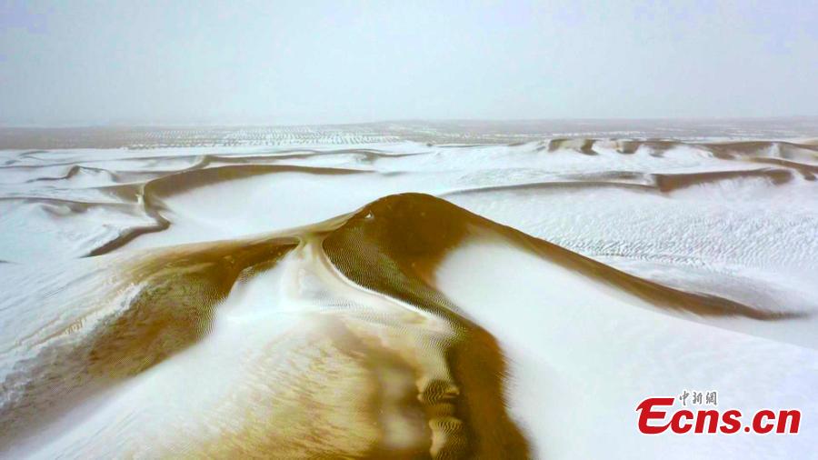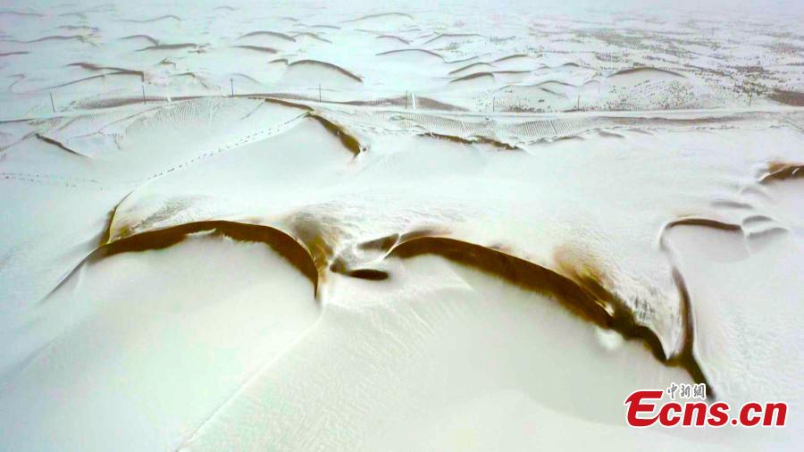 Sand dunes are covered by snow in Qiemo County, northwest China's Xinjiang Uyghur Autonomous Region, Feb. 2, 2024. (Photo: China News Service/Ma Jianghui)