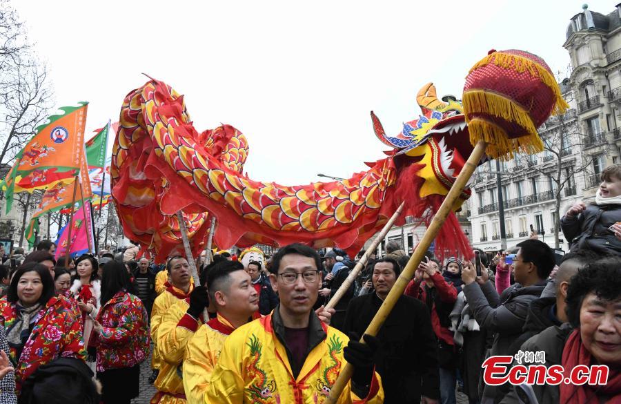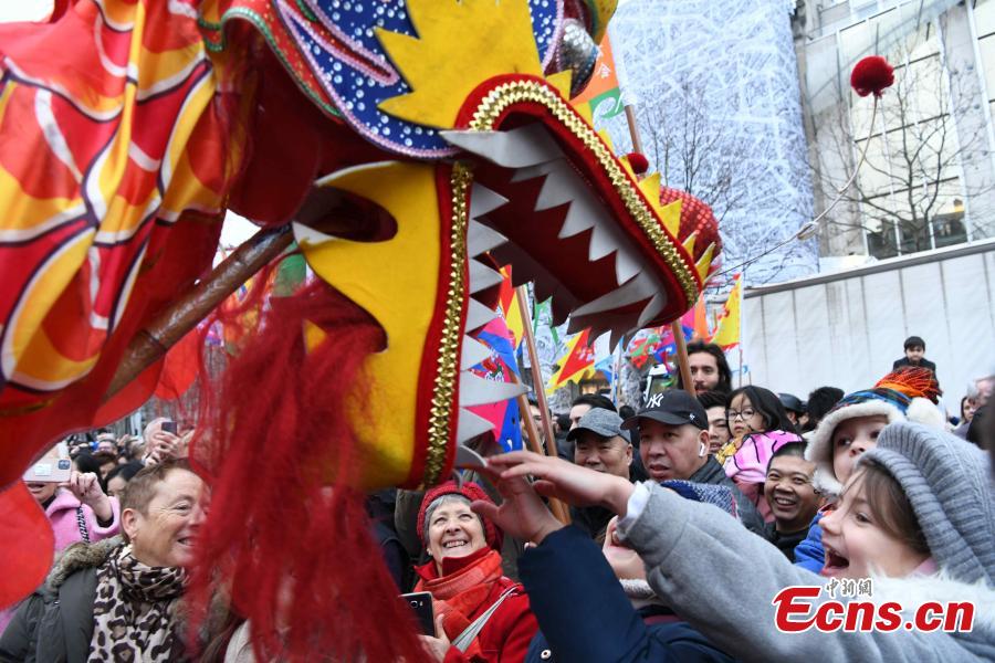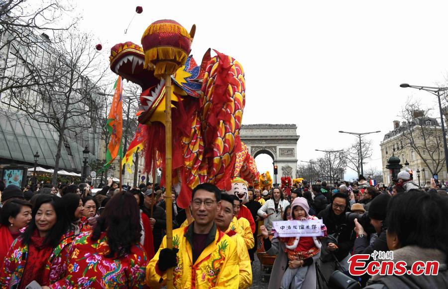 A dragon dance is performed on the Champs-Elysees avenue to celebrate the Chinese New Year in Paris, France, Feb. 4, 2024. (Photo: China News Service/Li Yang)