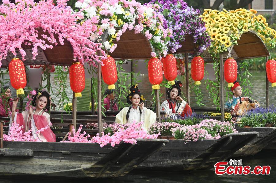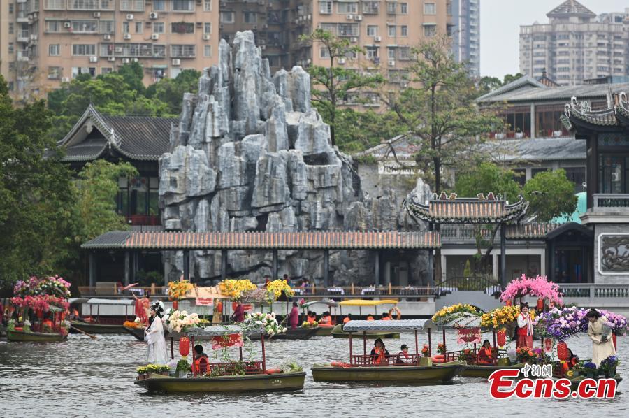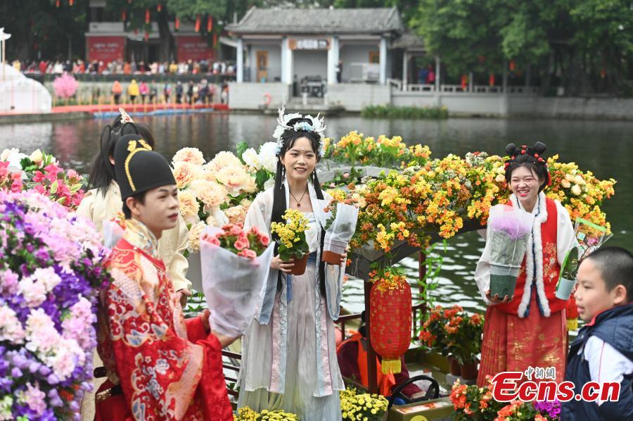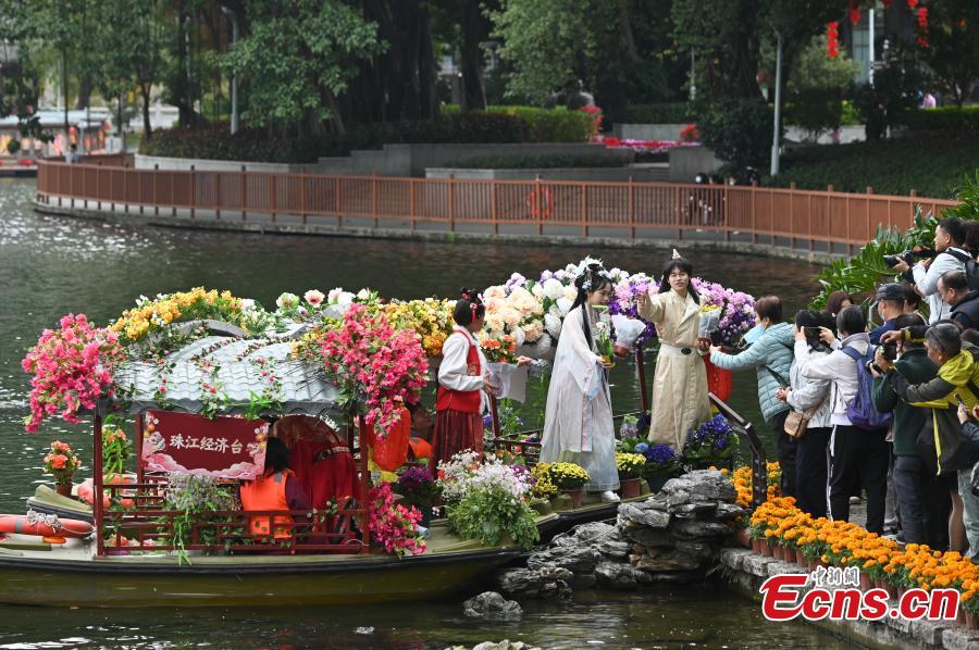 Women dressed in traditional Hanfu costume take part in a cruise parade at the 14th floating flower market, a unique tradition during China's Spring Festival on Liwan Lake in Guangzhou, south China's Guangdong Province, Feb. 6, 2024. (Photo: China News Service/Chen Chuhong)