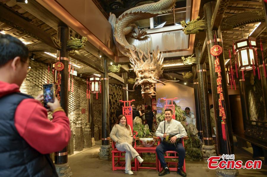Visitors pose for a photo with a magnificent dragon sculpture in a restaurant at Kuanzhai Alley in Chengdu, southwest China's Sichuan Province, Feb. 7, 2024. (Photo: China News Service/Liu Zhongjun)