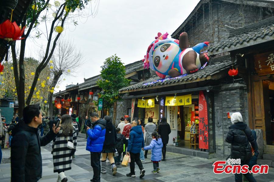 Decorations of pandas in dragon costumes are set up to greet the Year of the Dragon at Kuanzhai Alley in Chengdu, southwest China's Sichuan Province, Feb. 7, 2024. (Photo: China News Service/Liu Zhongjun)
