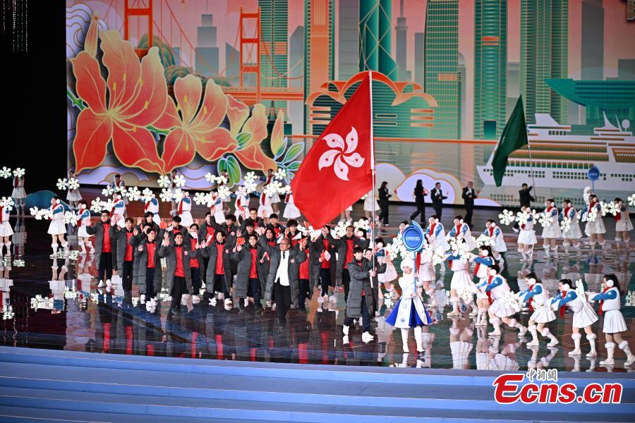 The delegation of Hong Kong Special Administrative Region parades into the stadium during the opening ceremony of the China's 14th National Winter Games in Hulun Buir, north China's Inner Mongolia Autonomous Region, Feb. 17, 2024. (Photo: China News Service/Cui Nan)