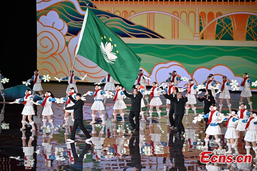 The delegation of Macao Special Administrative Region parades into the stadium during the opening ceremony of the China's 14th National Winter Games in Hulun Buir, north China's Inner Mongolia Autonomous Region, Feb. 17, 2024. (Photo: China News Service/Cui Nan)