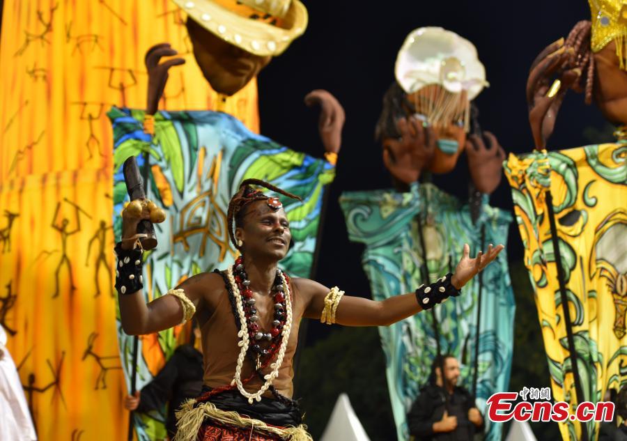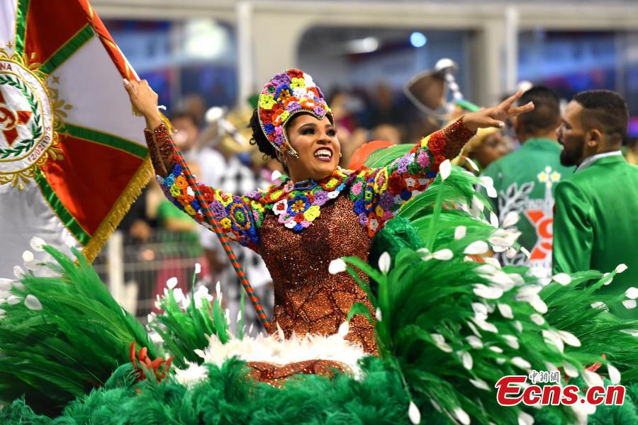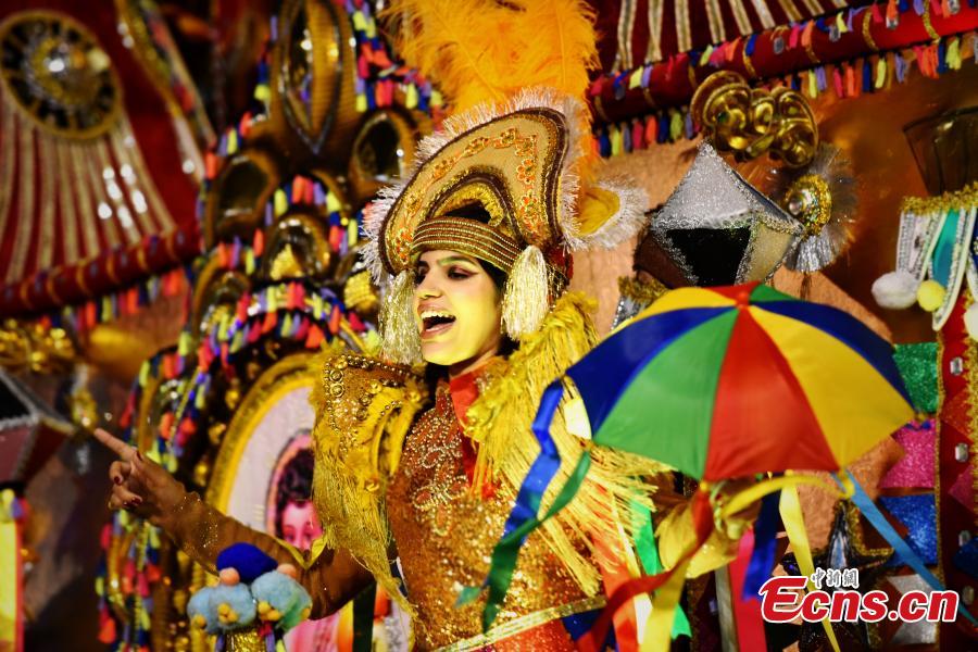 A reveler participates in the Champions Parade, the happiest of all samba parades in Rio de Janeiro, Brazil, on Feb. 17, 2024. (Photo: China News Service/Lin Chunyin)