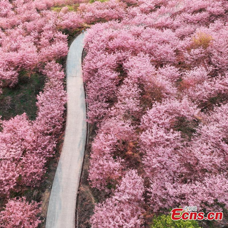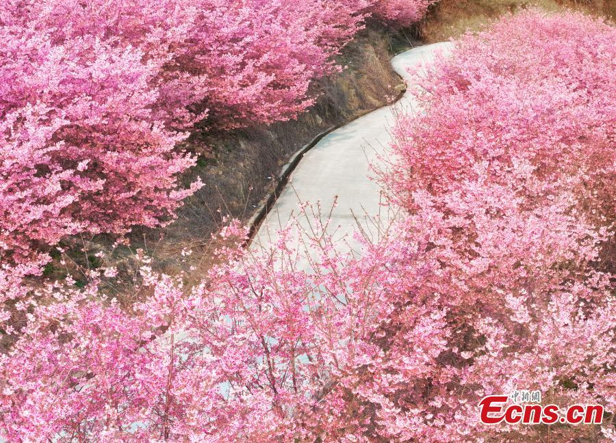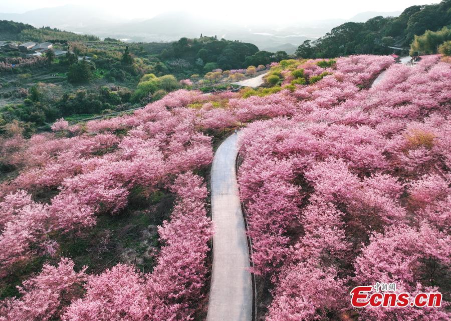 Cherry blossoms are in full bloom, creating an oil painting-like landscape in Longyan, east China's Fujian Province, Feb. 20, 2024. (Photo/VCG)