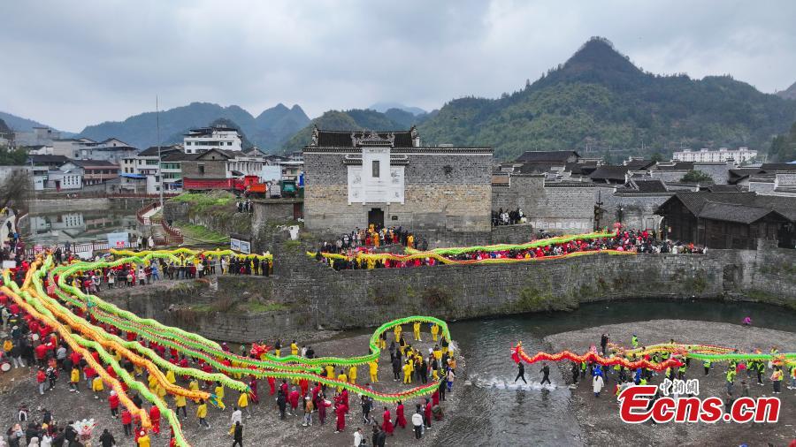 Villagers perform dragon dance to greet Lantern Festival in Zhaiying ancient town of Songtao Miao Autonomous County in Tongren, southwest China's Guizhou Province, Feb. 28, 2018. (Photo: China News Service/Yin Gang)