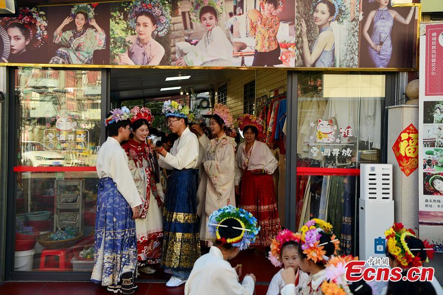 Girls wearing flowery headwear are seen at Xunpu Village of Quanzhou, east China's Fujian Province, Feb. 21, 2024. (Photo: China News Service/Zhang Bin)